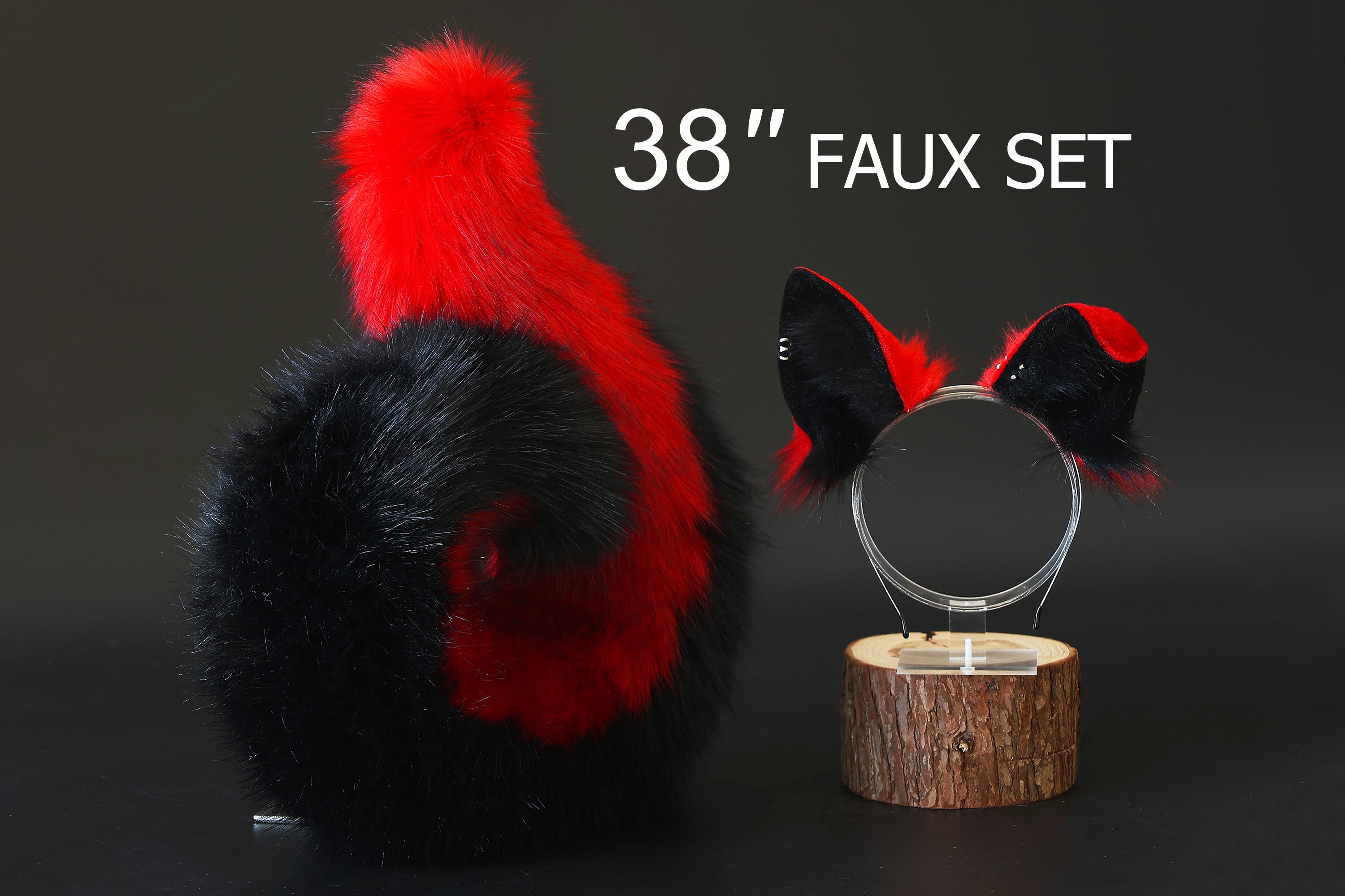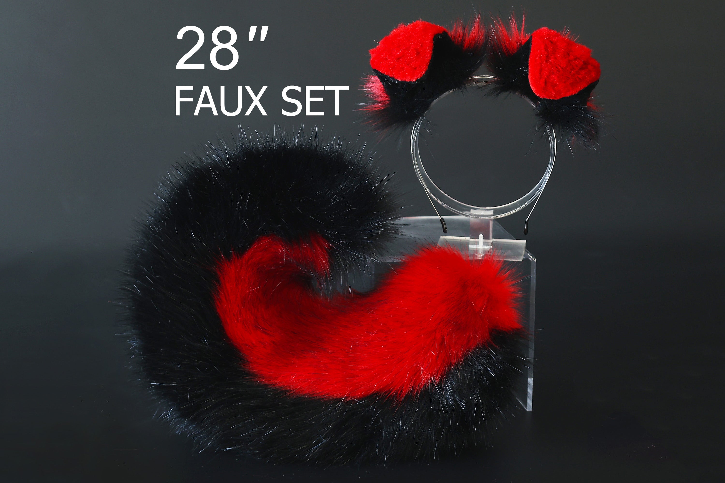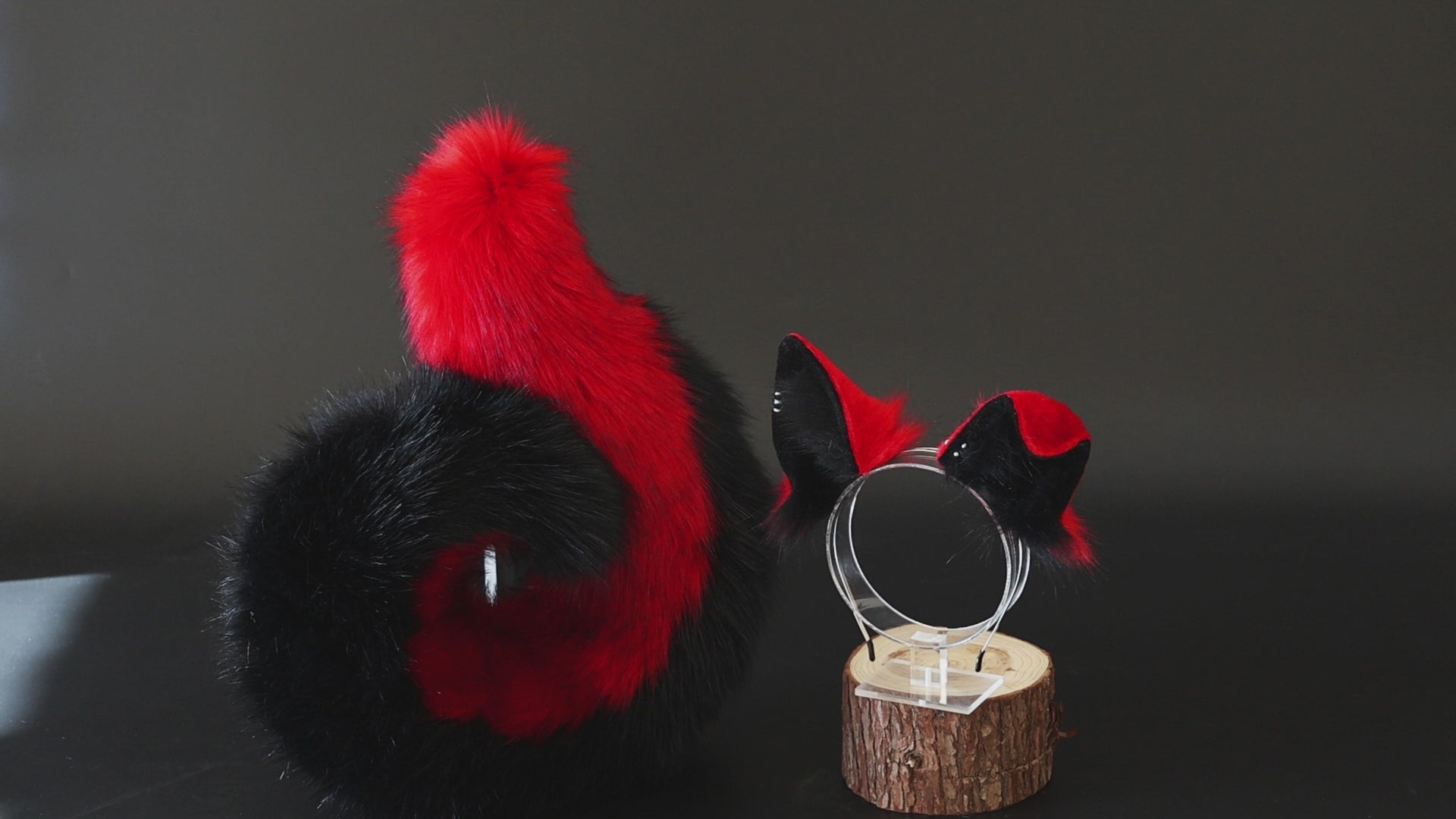 Red black faux fur red fox tail plug and ear wolf tail buttplug and ear kitten ear and tail plug set curved tail and ear plug cosplay -mature
