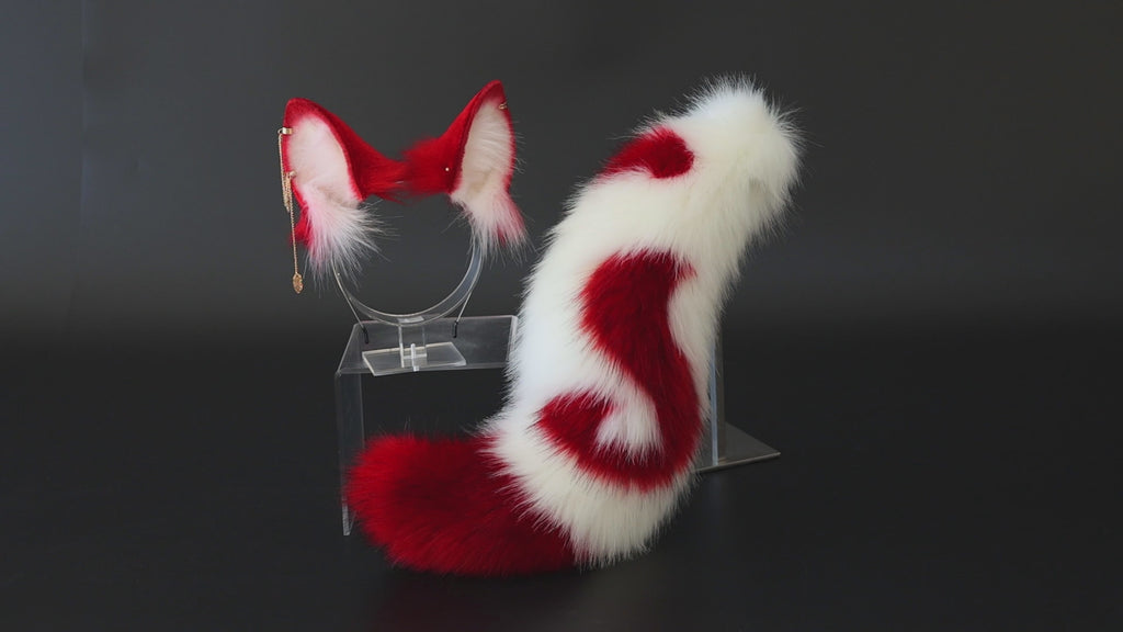 Red white stitching faux fur fox ears and tail curved wolf tail and ears cat tail and ears kitten ears and tail butt plug set anime cosplay role play